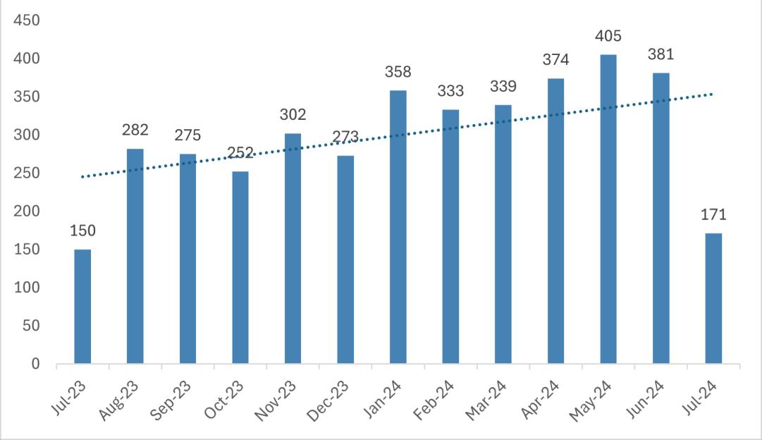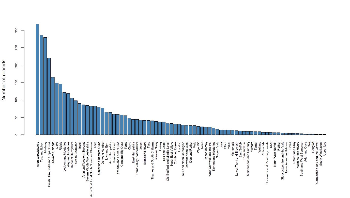 The project has continued to grow in popularity since the first year report (May 2022- July 2023), with now upward of 350 records regularly logged each month (Figure 1). The sampling effort across catchments was uneven, typical of ad-hoc citizen science monitoring schemes, but with clear potential for good coverage across England and Wales (Figure 2): the Water Quality Monitoring Network is now active in 76 catchments (an increase of 12 catchments since the first year). Four catchments (the Medway; the Swale, Ure, Nidd and Upper Ouse; the Avon Warwickshire; Test and Itchen) have each been sampled over 200 times by WQMN monitors in the first year of the project, and another 14 catchments have been sampled over 70 times. A further 58 catchments have been sampled at least once (Figure 3). There are, however, gaps in the reach of the network, and the network is keen to recruit volunteer recorders in the remaining catchments.