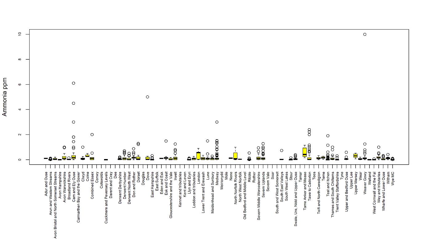 Ammonia readings varied from 0 to 9.99 ppm* (Figure 9) which is the full range of the Ammonia Colorimeter used. The majority were below the England and Wales wide upper standard for good ecological status, with less than 3.8% (67 out of the 1750) of readings exceeding it. Ammonia readings were similar across most catchments, with only a very few exceptions (Figure 10); ammonia readings in the Tame, Anker and Mease, North Norfolk, and London catchments were more variable than in other catchments. Outliers (white circles in Figure 10) are extreme values that could indicate individual pollution events, or poor performance of the test equipment (although that is not possible to confirm without further investigation).