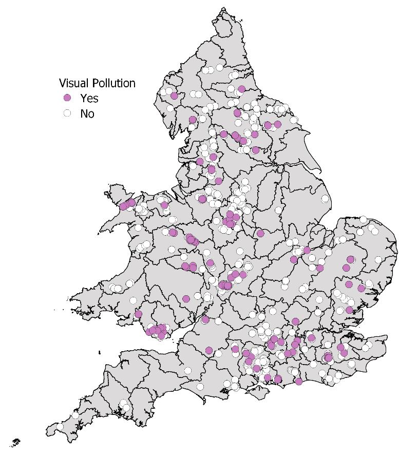Observations of algal blooms and visual pollution were uncommon Only 2.3 % of records (91/3907) recorded algal blooms, and 6% (240/3667) recorded visual pollution. Observations that were made were not spatially clustered, and instead were found in multiple regions of England and Wales (Figure 4). Algal blooms were observed in every month, although with higher rates in summer (e.g. 6.2% of July 2023 results) and lower rates in winter months (e.g. 0.3% of November 2023 results). There wasn’t an apparent seasonal pattern to records of visual pollution.