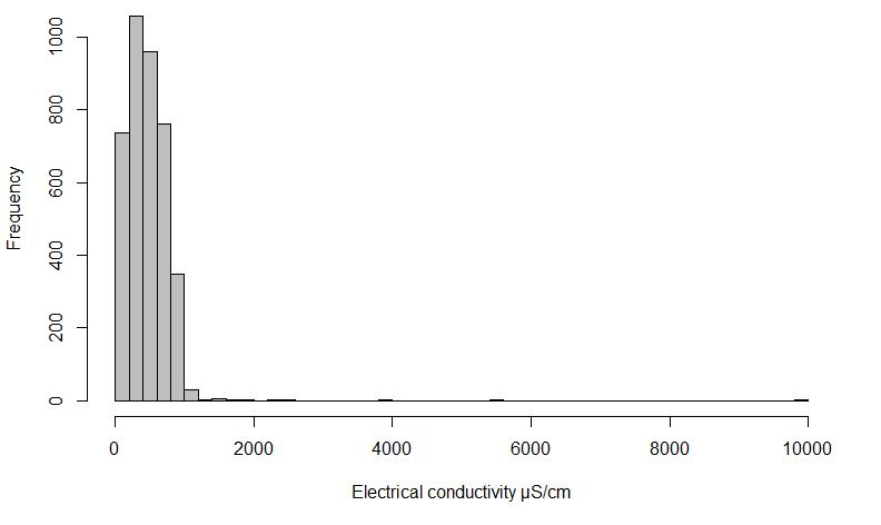 Figure 11 Frequency histogram of all Electrical Conductivity readings.