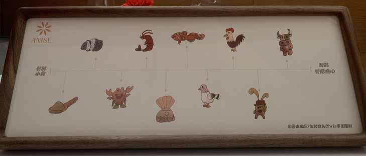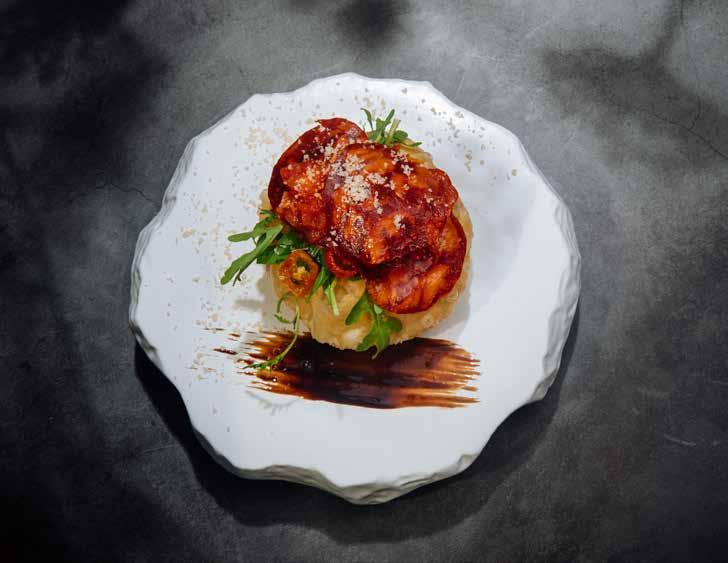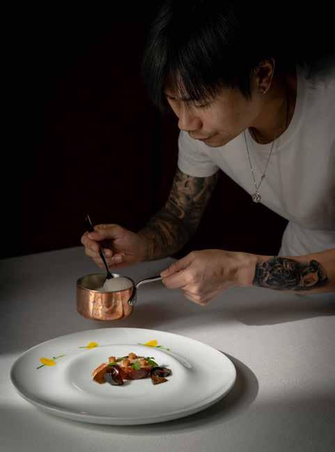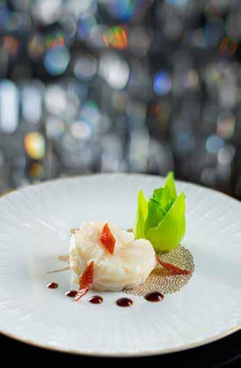 我創新搭配風乾了52個月的西班牙伊比利亞火腿,伴碟的 自製蠔汁融入了25年陳釀意大利黑醋,增加風味。我在御花 園烹調出的其中一道創新菜式便是香蔥椒麻醬蒸東星斑。粵菜 講求鮮,一般的傳統做法是用蒸魚豉油清蒸。為了增添不同的 口味,我特別研發出香蔥椒麻醬,增加了魚肉的層次,入口時 既吃到蔥香和椒麻的味道,從而刺激到食客的味蕾,呈獻與別 不同的體驗。