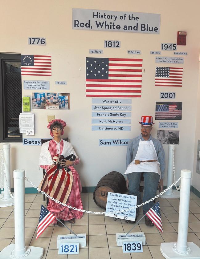 Recently the Evans-Brant Historical Society placed an exhibit at the Evans Town Hall. The display is a small version of the Erie County Fair exhibit. The fair’s theme this year was Red, White, and Blue. Society members created a series of flags representing various historical events. Included are an early Betsy Ross flag and the flag found in the rubble of 9/11. The display also features mannequins of Betsy Ross and Sam Wilson (the original Uncle Sam).