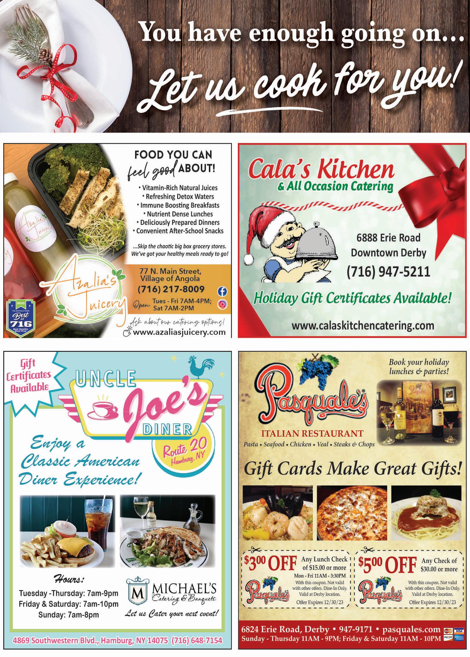 CHRISTMAS TREES & WREATHS. Choose and cut at Kathie and Jerry’s. 1731 Gowans, Angola. Wednesday- Friday 2pm until dusk. Weekends 10am until dusk. 716-4323936