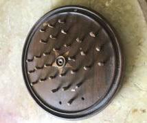His hobby was making puzzles. He turned a puzzle called “Fox and Geese” (See photo). He did not have a lathe to turn the walnut and maple, so he made one out of pine and used nails on back of faceplate to index points of the star.
