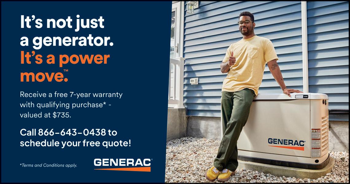 Prepare for power outages today with a GENERAC Home Standby Generator. Act now to receive a FREE 7-Year warranty with qualifying purchase* Call 1-855-948-6176 today to schedule a free quote. It’s not just a generator. It’s a power move.