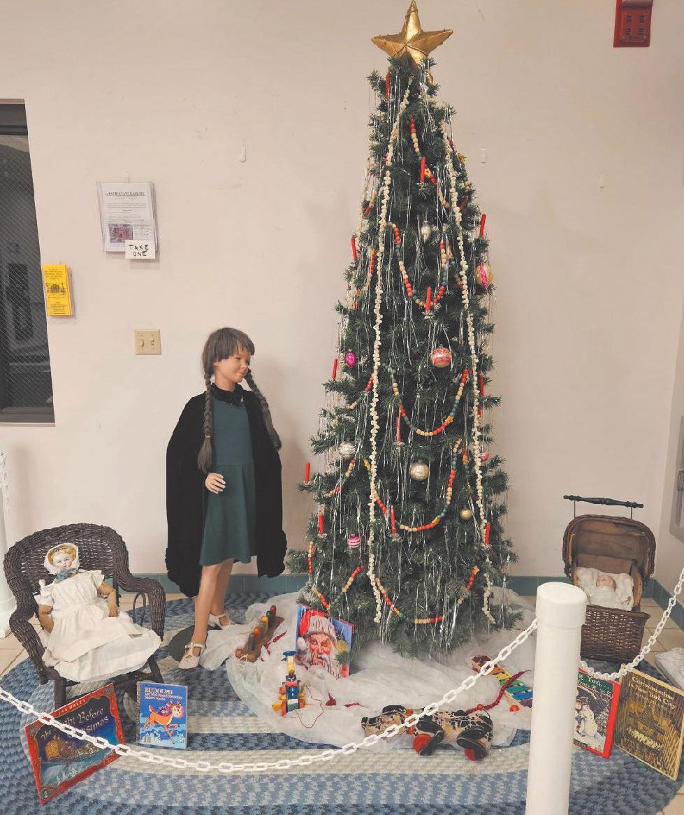 Evans Historical Society created a display depicting Christmas past at the Evans Town Hall. The exhibit features a Christmas tree decorated similar to a tree of 100 years ago. Strings of popcorn, cranberries, antique ornaments, tinsel, and candles adorn the tree. Antique toys, dolls and a buggy are placed near the tree. The display also includes a young girl dressed in period clothing admiring the tree.