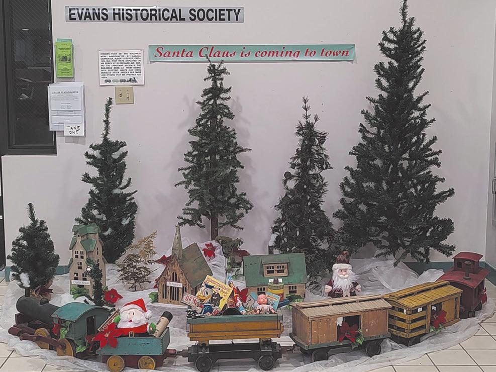 The Evans Historical Society recently created an exhibit entitled "Santa Claus is coming to Town". Featured in the display is an old wooden train and wooden houses. The long train carried old toys.