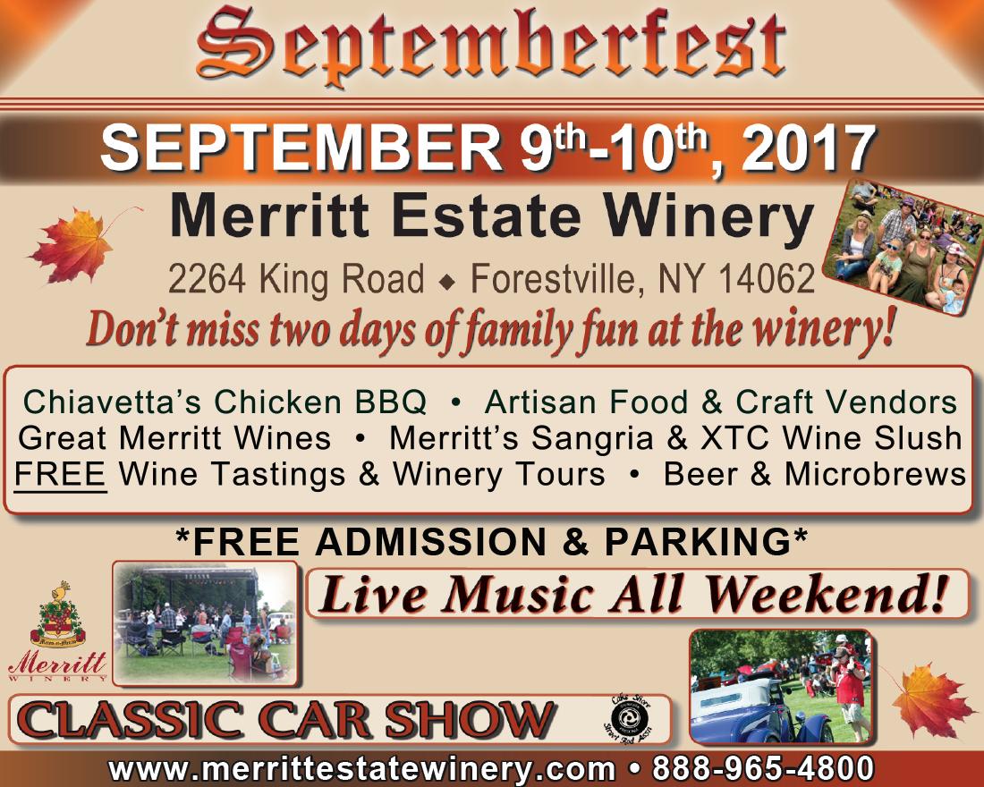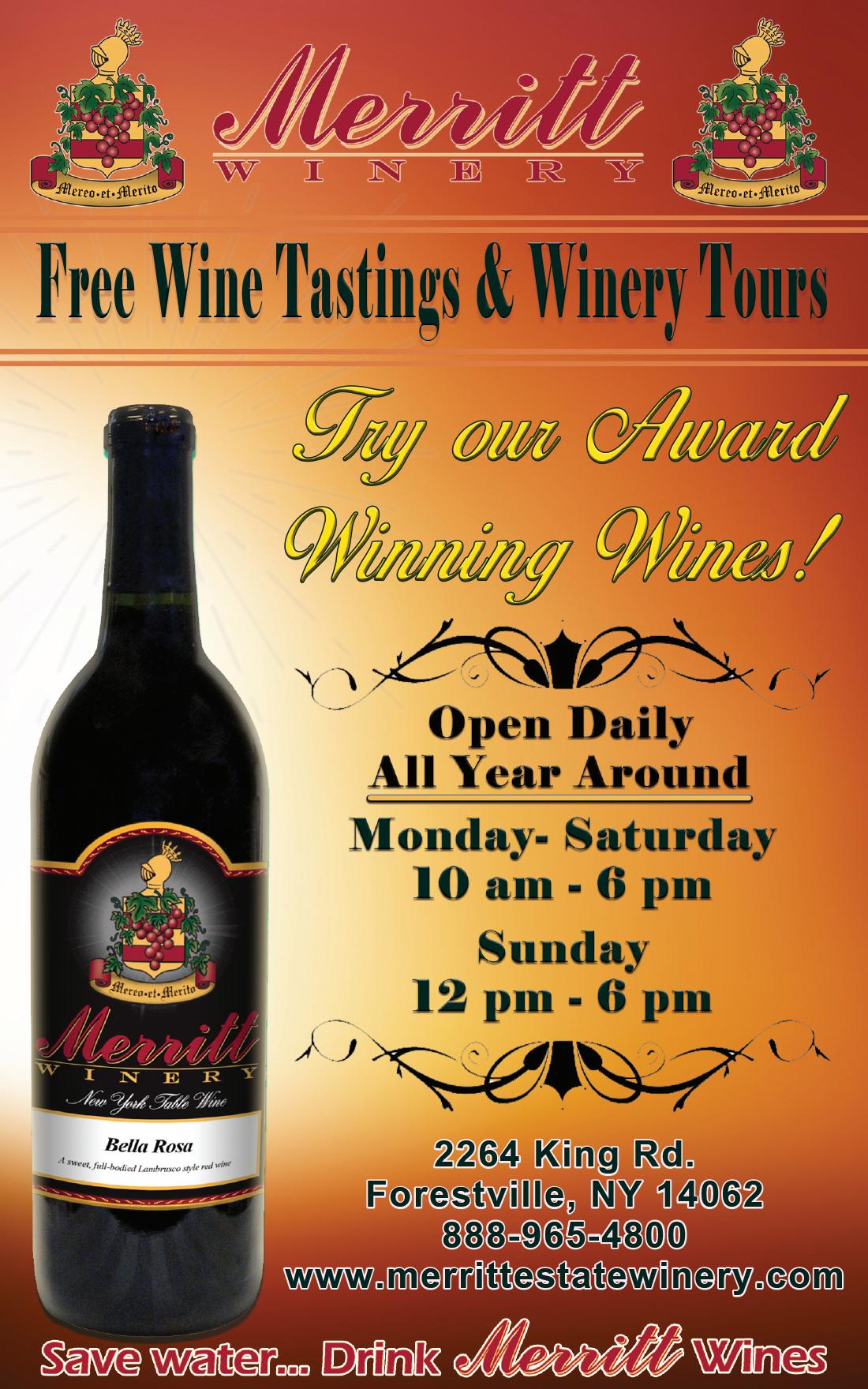 2016 marked the 40th Anniversary of Merritt Estate Winery in Forestville, NY! The Chautauqua County winery produces 26 vintages from dry to sweet and is best known for its trademark “Bella Rosa”. Merritt Estate Winery was one of the frst far m wineries organized in Chautauqua County under regulations established by Gover nor Carey in 1976; but the history of the Merritt Estate Winery dates all the way back to the late 1800’s. William T Merritt tur ned the estate into a fullfunctioning winery in 1976. Since then, his son Jason C. Merritt joined the family operation which continues to thrive each year. The father and sin duo dedicate themselves to their small winery , devoting their time and energy into producing some of the area’s fnest wines and look forward to celebrating their 41st year of wine making excellence this September