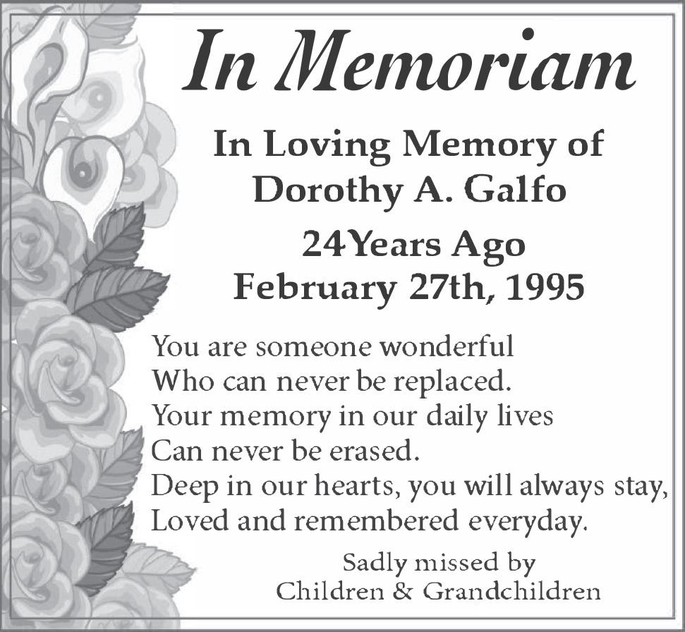 ...Edwards Cont’d all kinds. His favorite music was played on the country music station, WYRK. He sang with his friends in a choral group in Derby called God’s Angels. He attended St Paul’s Episcopal Church in Angola, NY. Bob brought an electric spirit of energy to every endeavor he participated in and celebrated all of his accomplishments. His friends were as varied as his life interests including a policeman he met on the bus ride to work, as well as television and radio personalities. Their impression of him was long-lasting and when they met a second time, most of them instantly remembered his name, which thrilled Bob. He took pleasure in the differences as well as the abilities of his friends and many were lifelong friendships, including John and Heather. Bob worked at Allentown Industries, a sheltered workshop in Buffalo, NY. He was recognized for more than 25 years of service. He loved and was proud of his job while brightening the lives of all who knew him there. He was often warmly referred to as the “Mayor of Allentown Industries.” In lieu of flowers, Bob’s family requests donations be made to Suburban Adult Service, Inc. (SASI), 960 W Maple Court, Elma, NY 14059. Bob has been a resident of SASI group homes (previously Claddagh Commission) for more than 35 years. Our family wishes to sincerely thank all administrative and staff members for their dedication and support. Please know you helped to make Bob’s life joyous and productive. Services were held on February 17, 2025 at Addison Funeral Home.