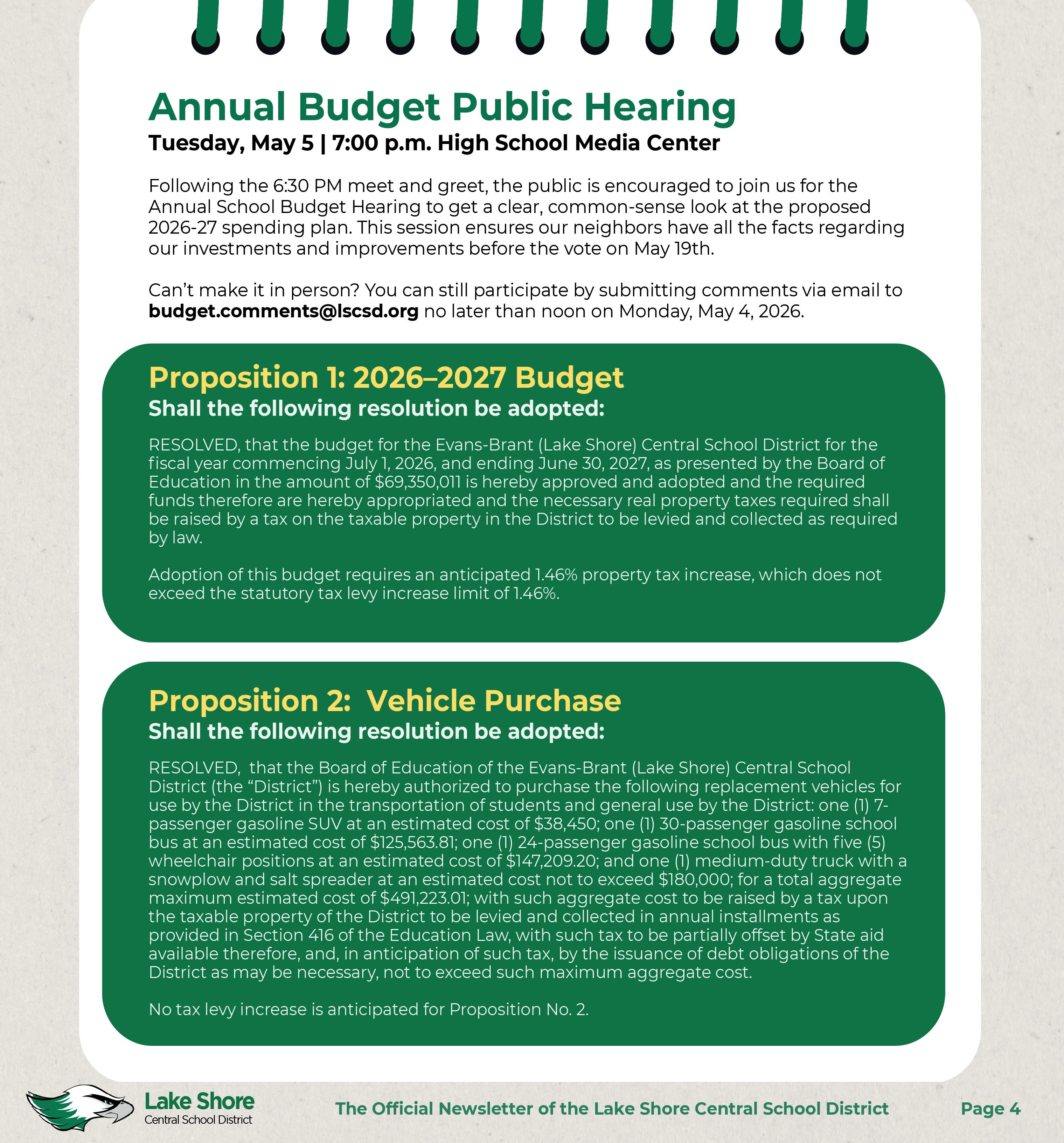 5/5 6:30PM @ High School Media Center – Meet the Candidates Night 7PM @ High School Media Center – Budget Hearing