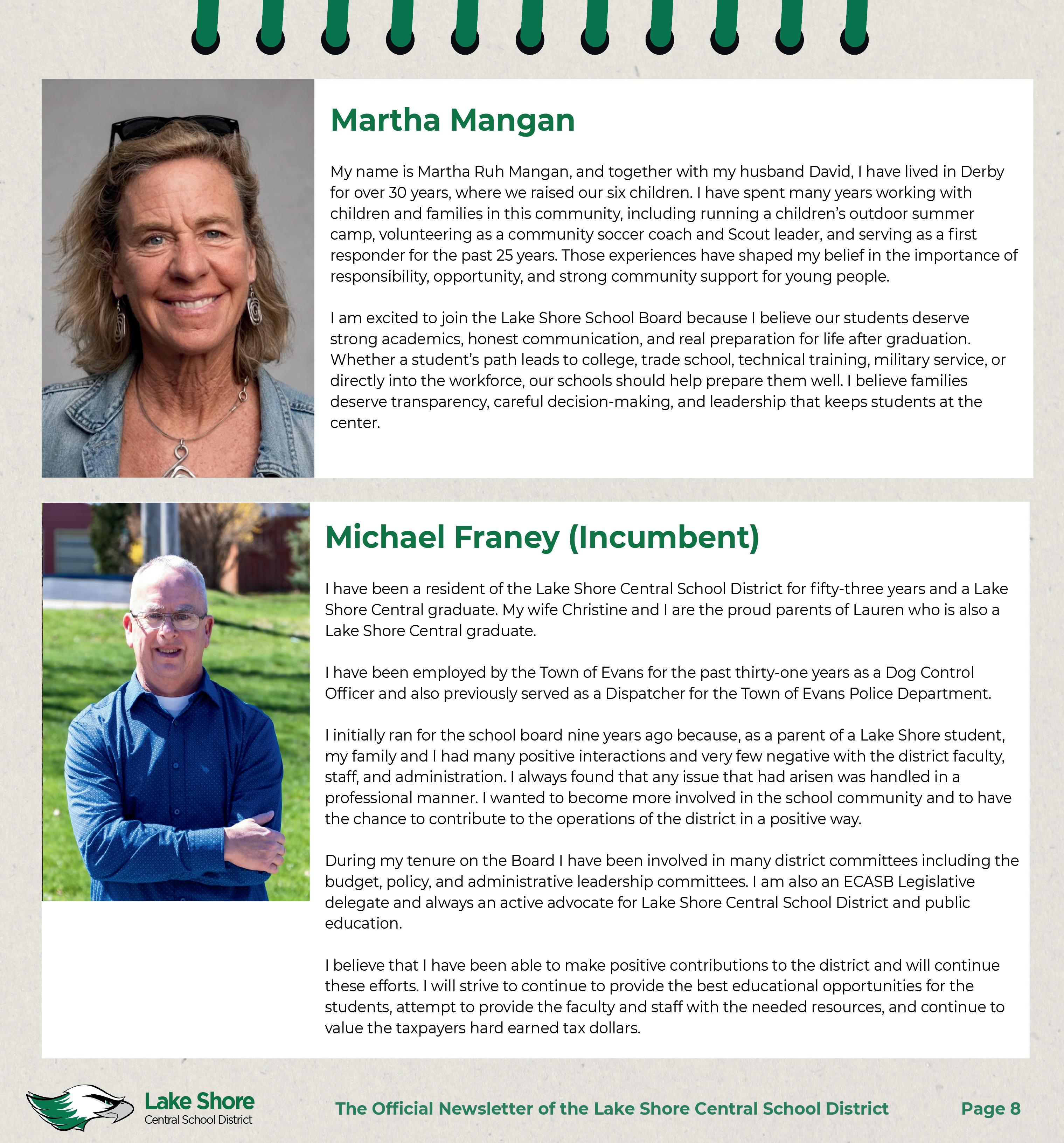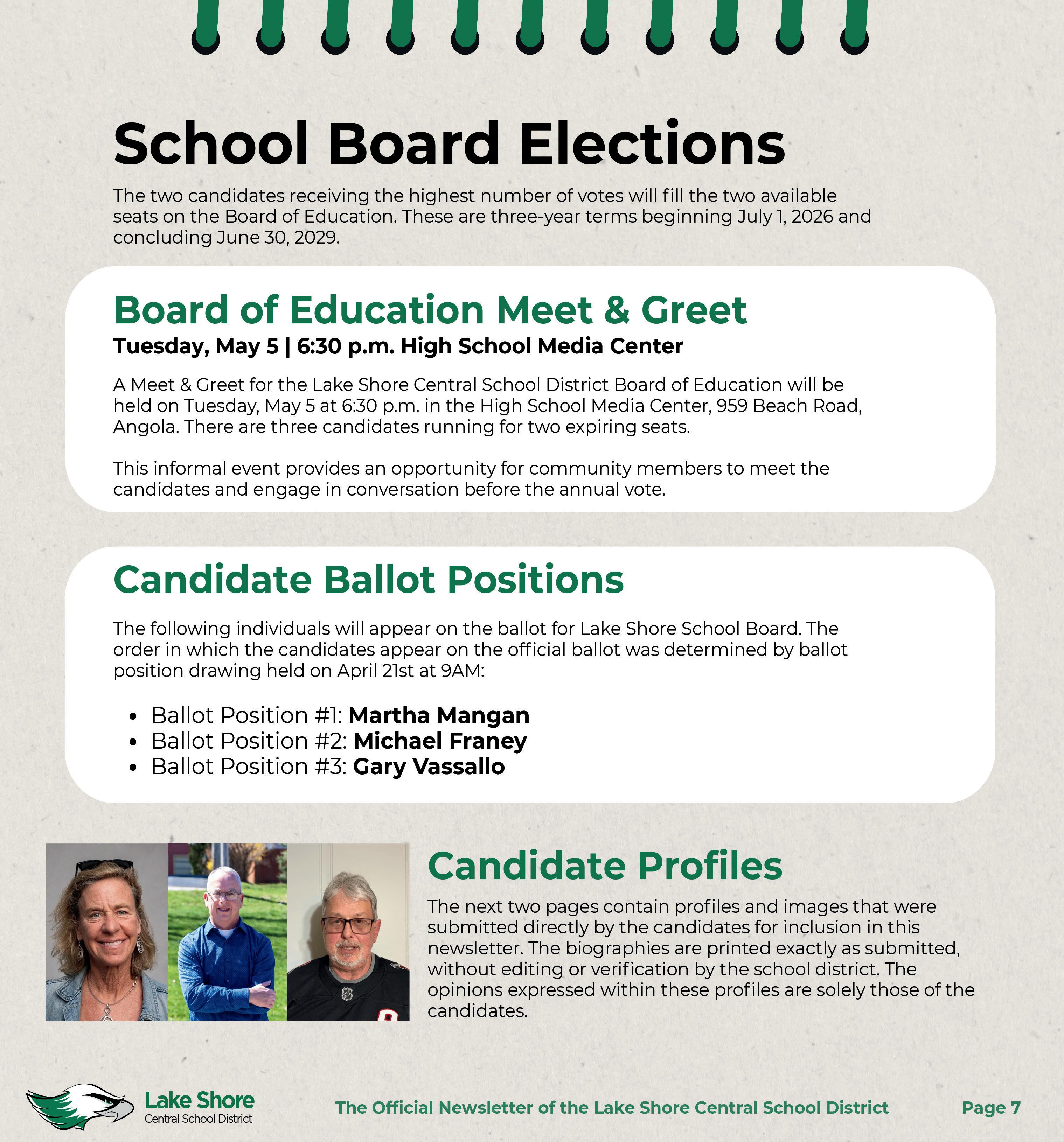 A night to “Meet the Candidates” for the Lake Shore Central School District Board of Education will be held on Tuesday, May 5th at 6:30 p.m. in the High School Media Center, 959 Beach Road, Angola. There are three candidates running for two open seats on the Board of Education. Board Candidates are: Michael Franey, Martha Mangan, and Gary Vassallo. The program will be a casual meet and greet with the candidates.