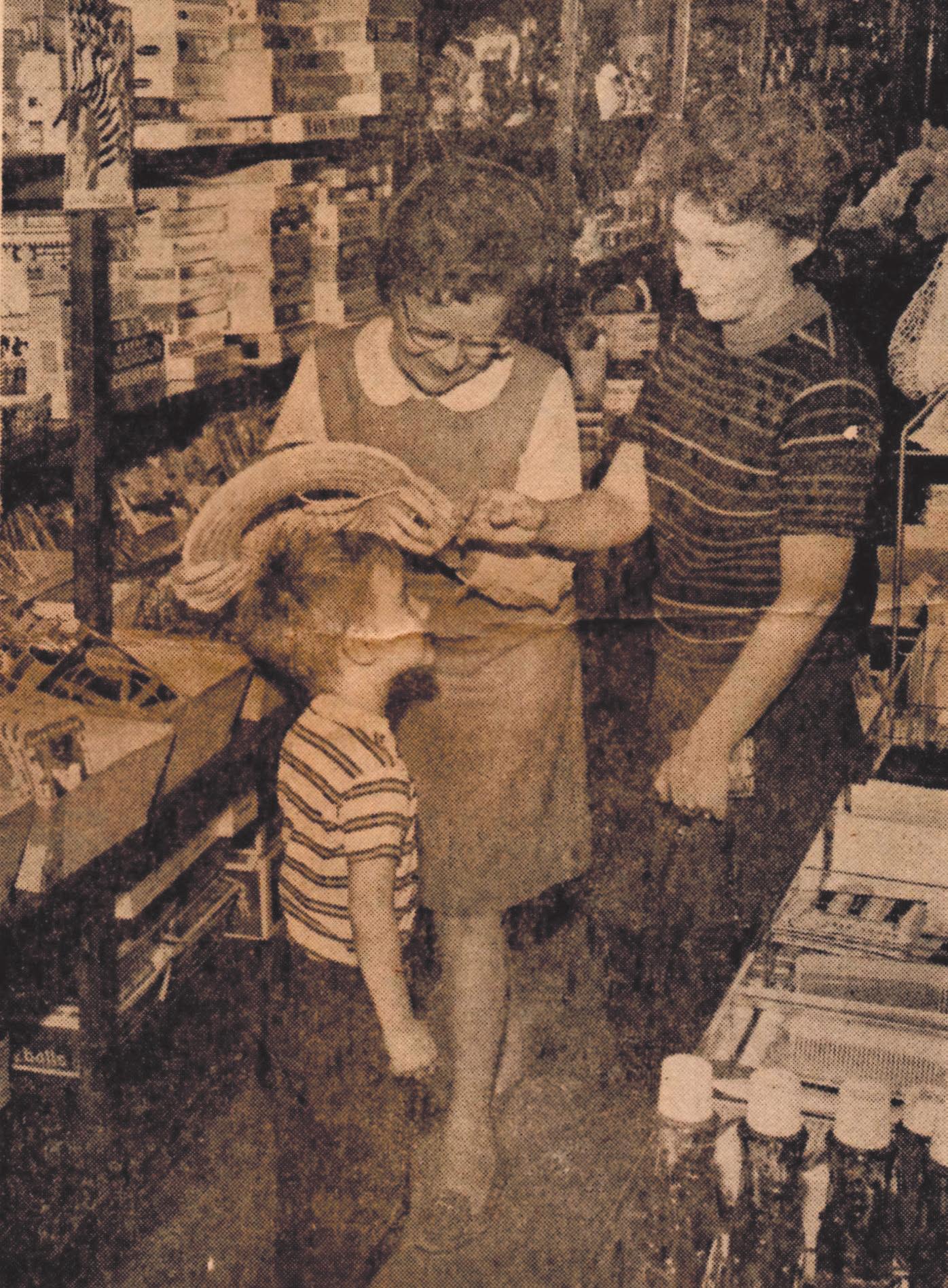 The accompanying photo shows Bertha helping a young boy select a hat as his mother watches.