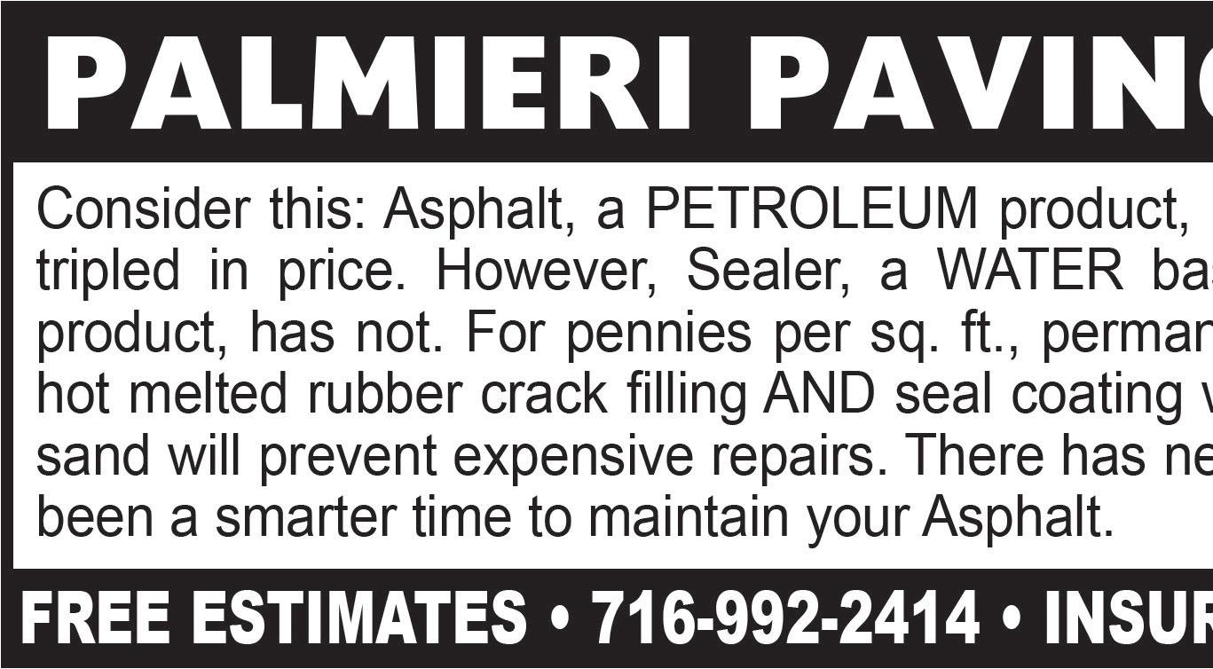 COAT: Top quality, local driveway sealing by David St. George. Free estimates, call 716-449-8683
