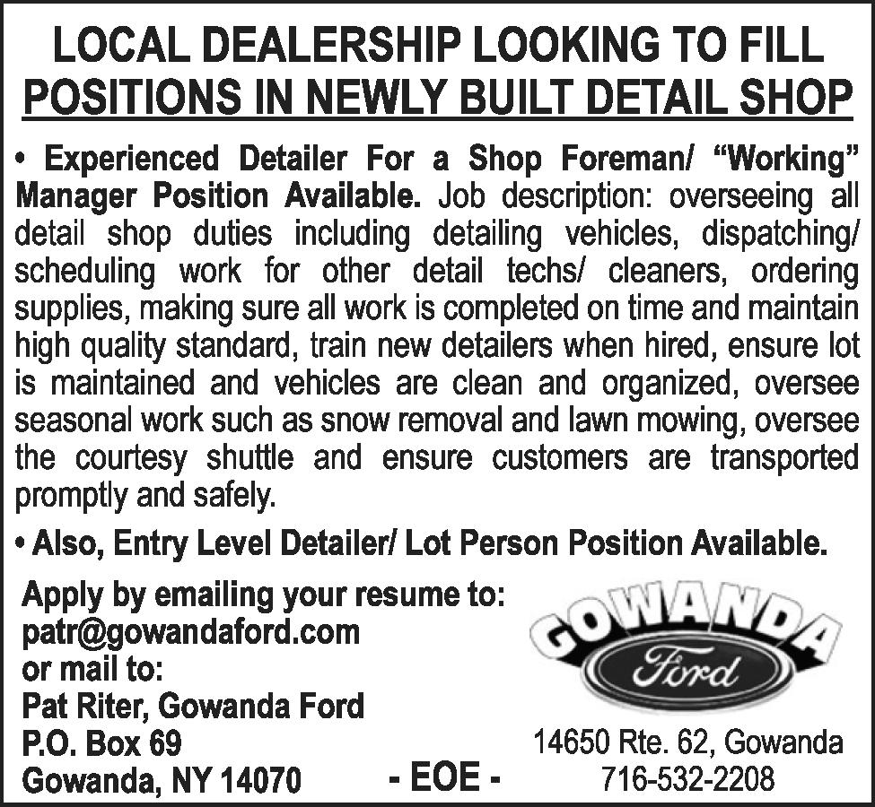 HELP WANTED: Looking for a qualified part time auto parts person. Will be handling over the counter sales and deliveries. Must enjoy working with people. Angola NAPA Store, 8814 Erie Road, Angola. 549-1106. RV parts store clerk. Job requires RV parts knowledge, and minimal plumbing and electrical. Phone skills required. Will assist in training. Full time. Please call 716-649-9654 to set up appointment. Pay negotiable depending on experience.