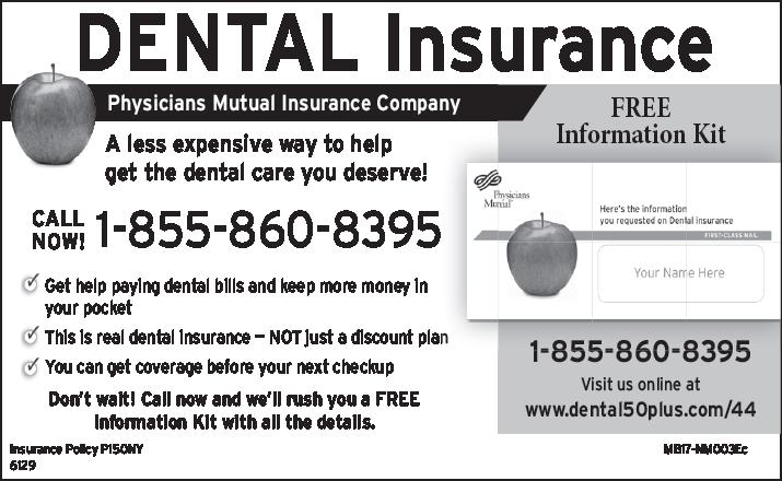 DENTAL INSURANCE. Call Physicians Mutual Insurance Company for details. NOT just a discount plan, REAL coverage for 350 procedures. 888-623-3036 or http://www.dental50plus. com/58 Ad# 6118
