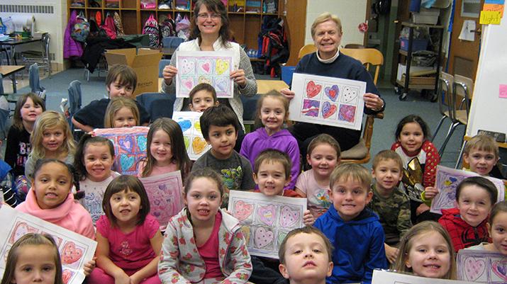 Kindergarten students at A.J. Schmidt Elementary wanted to spread some kindness in our community and decided to make Valentine's placemats for Meals on Wheels. These placemats were then included in the Valentine's Day meals they distribute throughout our area. They were hoping to place a smile on many faces for Valentine's Day. The kindergarten students were then fortunate enough to be visited by two representatives from Meals on Wheels, Ms. Christine Procknal, support services clerk, and Ms. Dawna Bennett, nutritionist. They talked to the students about the services Meals on Wheels provides and what goes into making a balanced meal. The kindergarteners did a great job spreading some kindness in our community.