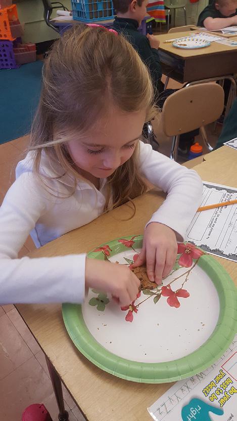 In Mrs. Lauren Vacanti’s second grade class at SS. Peter & Paul School in Hamburg, students pretended to be a paleontologist. They had to carefully remove chocolate chips from the cookie using just a small instrument like paleontologists do when they dig for fossils. Pictured above is Sara Sampson as she works carefully on her cookie.