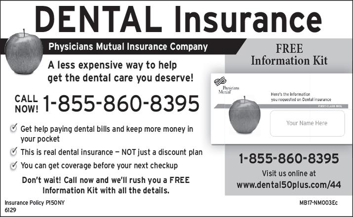 DENTAL INSURANCE. Call Physicians Mutual Insurance Company for details. NOT just a discount plan, REAL coverage for 350 procedures. 888-623-3036 or http://www.dental50plus. com/58 Ad# 6118