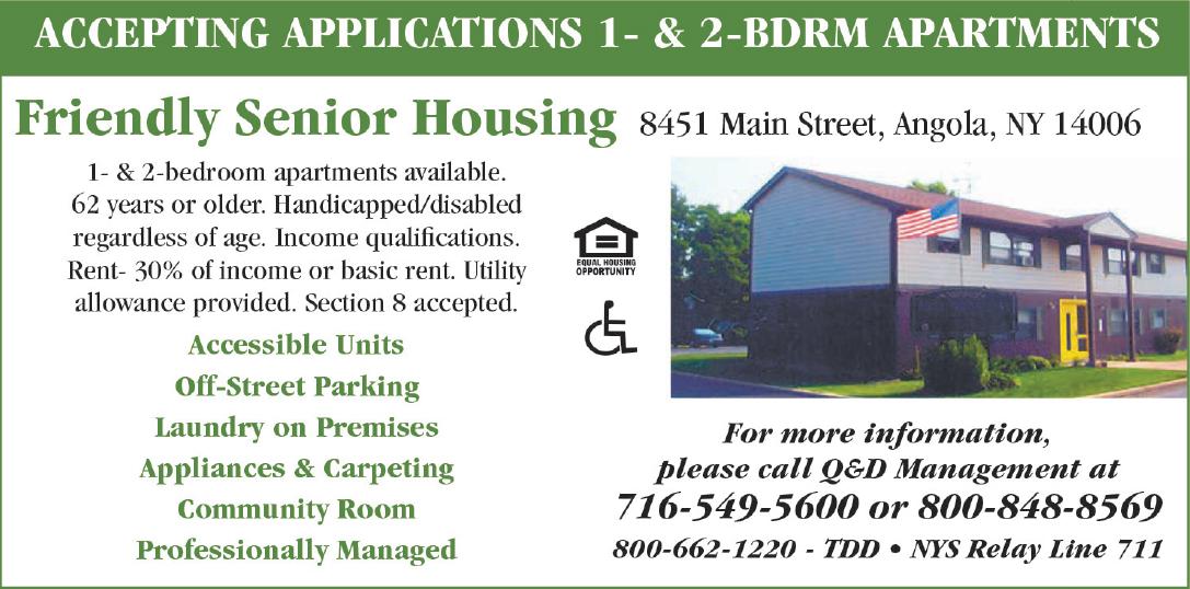 HAMBURG FOR RENT: Section 8 senior apartments. Smoke free, newly renovated kitchens and new windows. We make your life better at BETHEL ESTATES. 4647 Southwestern Blvd. 648-6444 bethelestatesonline.com EHO