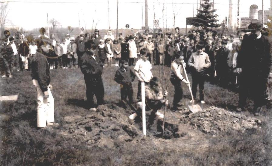 Although Arbor Day was officially celebrated on April 25th of 1969, according to notes on the back of the photo, the Farnham Boy Scouts ceremoniously honored the day by planting a few trees on the Farnham school property on April 5,1969. The Farnham School was located kitty-corner from the Farnham water tower at Erie Road and Commercial Street, Farnham, N.Y. The school, also referred to as Brant District #5, was closed in 1976 and the building demolished in 2007. These trees remained standing, providing shade to the neighboring St. Anthony’s parking lot, until a Dollar General Store was built on the empty school lot in 2013.