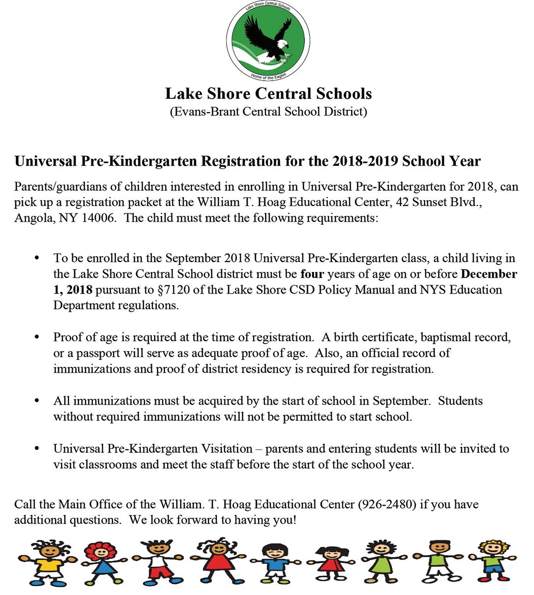 •To be enrolled in the September 2019 Universal Pre-Kindergarten class, a child living in the Lake Shore Central School district must be four years of age on or before December 1, 2019 pursuant to §7120 of the Lake Shore CSD Policy Manual and NYS Education Department regulations.