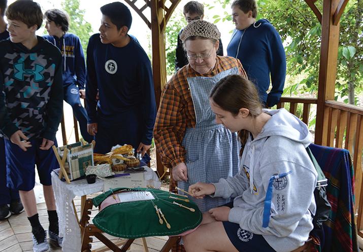SCS Students in 7th and 8th grade joined several other schools at the Hamburg Fairgrounds for Living History Day at the Hamburg Fairgrounds. This event provided an immersion into the Civil War era and the presentations included: Infantry equipment and drill simulations, Artillery, Mounted cavalry, Blacksmithing and iron forge, Bugle calls & signal corps, Perspectives of the Confederacy, Presentations from a medical steward, Discussions of the roles of women at the home front, Engineering, Nurses of the sanitary commission, Generals Grant and Lee interpreters and Lessons of etiquette. Pictured: Emma Katra learning how to make lace. Contributed by Southtowns Catholic