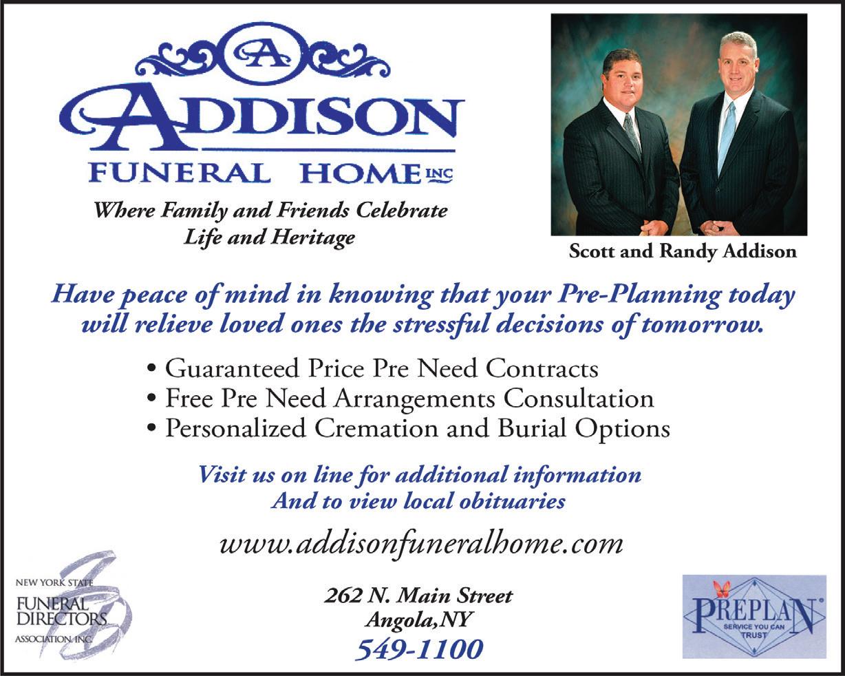 the Angola, NY area with a variety of personal legal services: •Real Estate Closings •Wills & Estates • Divorce and Separation/ Family Law • Criminal Law • Vehicle & Traffic • DWI •Land lord/Tenant • Personal Injury John Grennell, Esquire Life-Long Local Resident 11 Maple Street, Angola, New York 14006 (716) 549-0810, Ext. 33 • (716) 549-6581 Fax j.grennell@yahoo.com L atimore -S chiavone LSS S 8434 North Main Street, Angola NY 14006 • 716-549-3311 • latimoreschiavonefuneralhomeinc.com