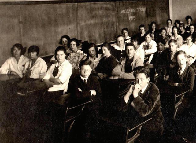 Today’s photo is split in half for possible closer viewing. When the photo is enlarged, we can read the words “Angola High School 1919” written on the blackboard. We wish we had the names of the students for you, but possibly there are some 2nd, 3rd and 4th generation relatives still living locally who may be able to provide some guidance. This photo was included in the donated box of items from Janet Walker to the Brant-Farnham Historical Society. Her dad, was John Walker (one time Mayor of Farnham) and her grandfather was Lee Walker (gateman for the railroad in the Village of Angola). The Walker family was well known in the Village of Farnham.