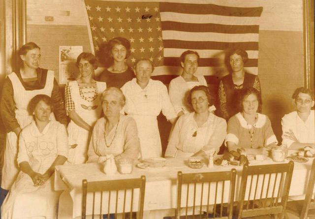 A Ladies Aid Society is mentioned in the Holy Cross 100 Year Anniversary booklet of 1964, as well as in a few written Farnham family histories we have come across in a our published history books. The Holy Cross booklet also mentions that “the [Ladies Aid] Society conducted dinners (on one occasion 625 chicken dinners were served), strawberry socials, fancy good sales, and other innumerable affairs, the proceeds used in the improvement of the church and parsonage.” We believe it is possible that these women pictured are also of this Ladies Aid group. We have not yet confirmed the year of this photo (even with the calendar on the back wall), but… we have a hint of the time frame because the pictured U.S Flag has 48 stars. The 48 star flag flew from July 4th, 1912 to July 3, 1949. That narrows it down some. (Ha!) Holy Cross Lutheran Church (also a beautiful brick structure) with a welcoming congregation, is located on Church Street in the Village of Farnham.