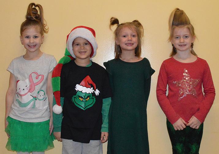 Students in Miss Rozwood’s Grade 1 class had Grinch day on December 18th. The students left their uniforms at home and dressed as characters that would be in the “How the Grinch Stole Christmas” Book. All the their centers had a Grinch theme and the kids had to write a letter to the Grinch asking him to not steal Christmas. At the end of the day, the kids were able to watch the cartoon ‘How the Grinch Stole Christmas”. Pictured: Morgan McCarthy, Aidyn Urbanowicz, Chloe Wagner & Campbell Rutz