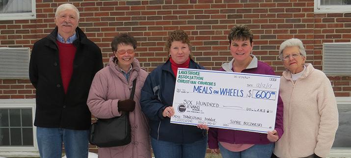 The Lakeshore Association of Christian Churches (LACC) held their tenth Annual Community Thanksgiving Dinner. Becuase of the generosity of many, this event was made possible and was very successful and we gave 20% of our donations to help Meals on Wheels. A check was presented to Lisa Woodring the Chief Development Officer of Meals on Wheels for $600. Pictured above from left to right: Bill Duzen (MPB), Kathy Kauhl and Lorraine Glashauser (LACC), Lisa Woodring (Meals on Wheels), and Fran Downey (MPB) Contributed by Ed Conboy Jr.