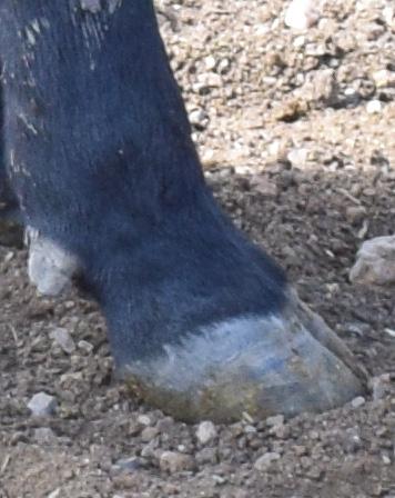 When assessing the foot angle in either front or rear feet, scorers are assessing the depth of heel present, relative to the angle of the front of the claws. The following pictures show some of the variation in foot angle. The blue lines highlight the greater depth of heel present in the animal on the left compared to the animal on the right. This greater depth has resulted in a sharper angle in the foot of the animal on the right compared to the picture of the animal on the left. Both images show the front foot angle of the animals.