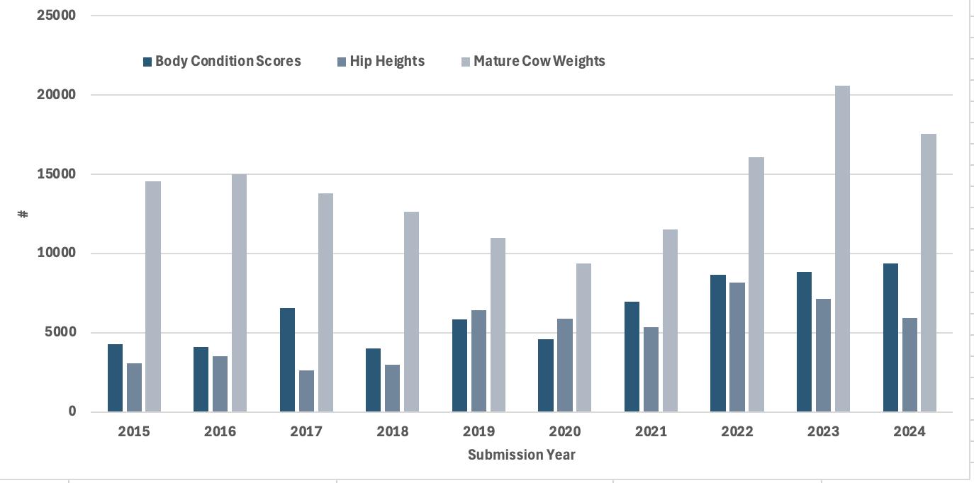 Based on the 2023 enhancements which ramped the evaluation up to ‘state-of-the-art’, and the response from members in recording significantly more weights, body condition scores and hip heights on their cow herds (figure 1), the MBC and MCH RBVs have been transitioned to EBVs.