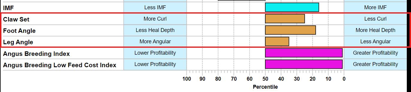 To make interpretation more intuitive, the descriptions on the percentile graphs (figure 5) for the three structural soundness EBVs (Claw Set, Foot Angle and Leg Angle) have been modified. They have been changed from ‘higher score’ and ‘lower score’, which is related to the associated beef class structural assessment scoring system, to more descriptive language associated with what can be expected in the way of progeny
