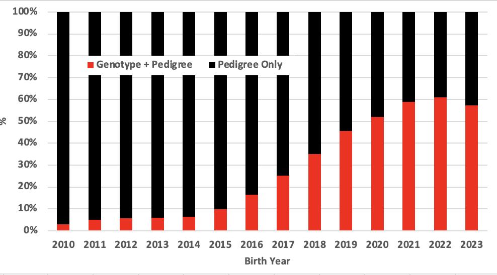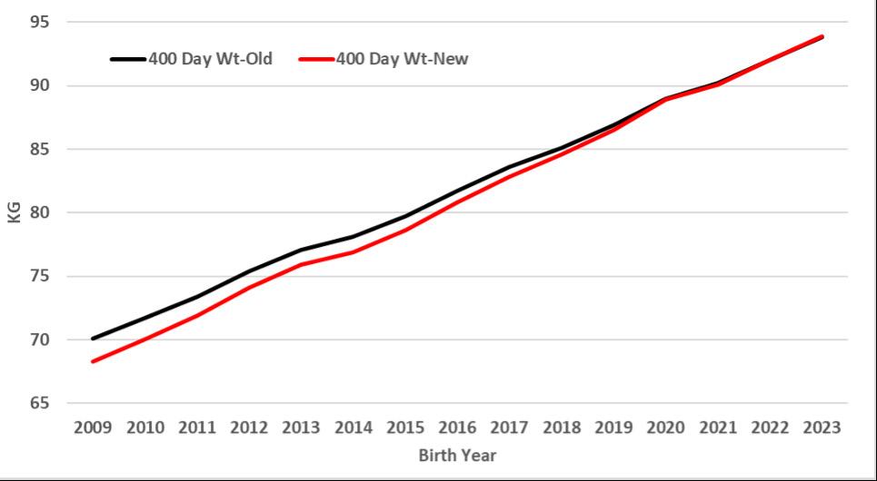The impact of this alignment is mainly seen in the long-term genetic trends, and results from the fact that most of the genotyping has occurred in recent generations, with pedigree only information available in the pre-genomics era (figure 8). The main observation is that genetic trends across the TACE population have generally increased. While the EBVs and Selection Indexes of the current generation look similar, the yearon-year genetic trend (e.g. change in average EBV or Selection Index by birth year) have increased over time, which better reflects the actual genetic progress achieved. An example of this comparing the genetic trend based on the TACE 400 day weight EBV is shown in figure 9.