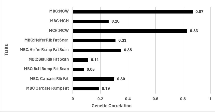 The genetic parameters for the MBC and MCH traits were recently calculated and reviewed, and is a large part the reason for the transition from RBVs to EBVs. The traits are heritable (figure 3), and the estimates are consistent with prior similar studies on similar traits. Furthermore, in relation to the fat traits, the genetic correlations (figure 4) show that MBC is genetically a very different trait compared to the bull and heifer fat ultrasound scans and steer carcase fat measurements. This means that more genetic progress or change can be made to cow herd body condition through direct selection, rather than via