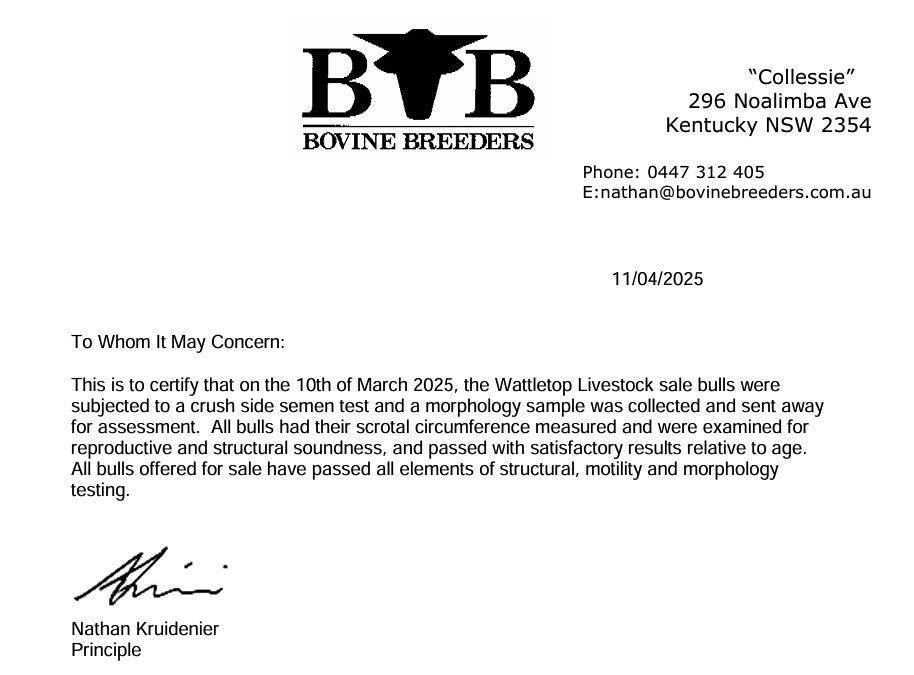 In the unlikely event of infertility, provided it is not caused by injury, stress or disease contracted after our sale, we will endevour to supply a satisfactory replacement if available or issue with a credit equal to the purchase price minus the salvage value which may be used at future Wattletop Livestock Bull sales. This guarentee stands for 12 months after the bull sale.