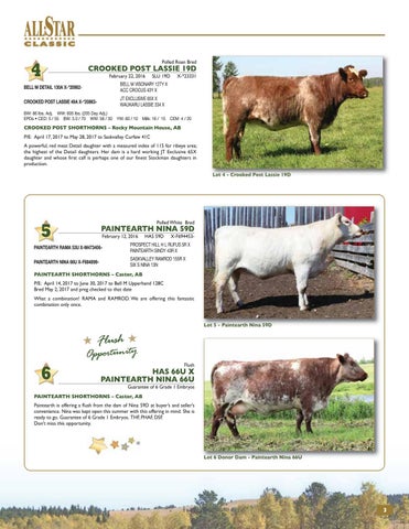PAINTEARTH SHORTHORNS – Castor, AB Paintearth is offering a flush from the dam of Nina 59D at buyer’s and seller’s convenience. Nina was kept open this summer with this offering in mind. She is ready to go. Guarantee of 6 Grade 1 Embryos. THF, PHAF, DSF. Don’t miss this opportunity.