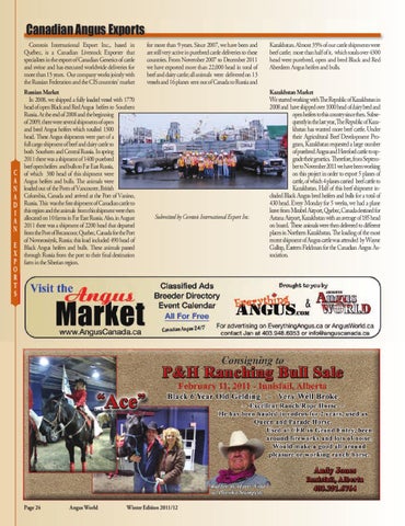 Russian Market In 2008, we shipped a fully loaded vessel with 1770 head of open Black and Red Angus heifers to Southern Russia. At the end of 2008 and the beginning of 2009, there were several shipments of open and bred Angus heifers which totalled 1300 head. ese Angus shipments were part of a full cargo shipment of beef and dairy cattle to both Southern and Central Russia. In spring 2011 there was a shipment of 1400 purebred beef open heifers and bulls to Far East Russia, of which 380 head of this shipment were Angus heifers and bulls. e animals were loaded out of the Ports of Vancouver, British Columbia, Canada and arrived at the Port of Vanino, Russia. is was the first shipment of Canadian cattle to this region and the animals from this shipment were then allocated on 10 farms in Far East Russia. Also, in August 2011 there was a shipment of 2200 head that departed from the Port of Becancour, Quebec, Canada for the Port of Novorossiysk, Russia; this load included 490 head of Black Angus heifers and bulls. ese animals passed through Russia from the port to their final destination farm in the Siberian region.