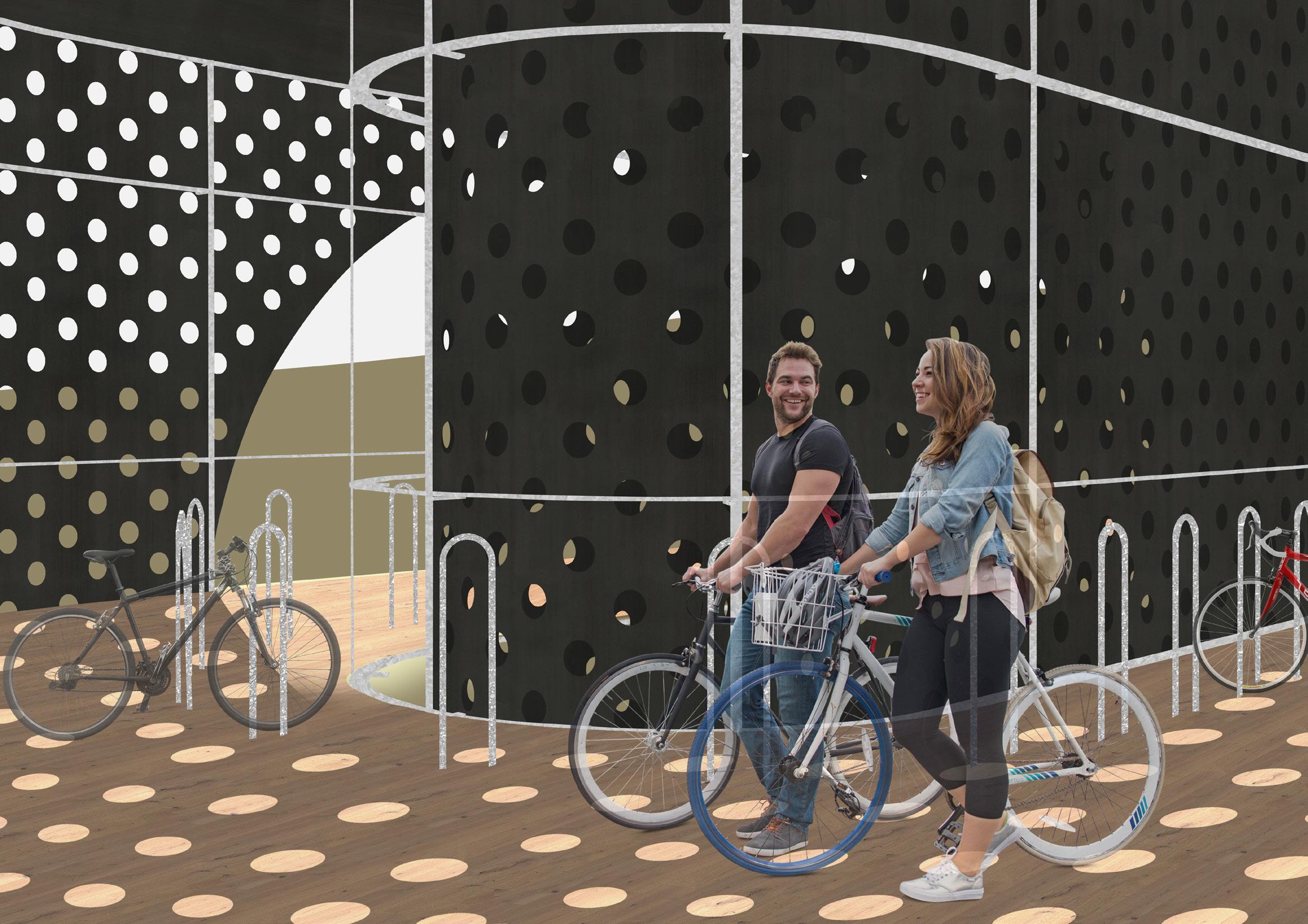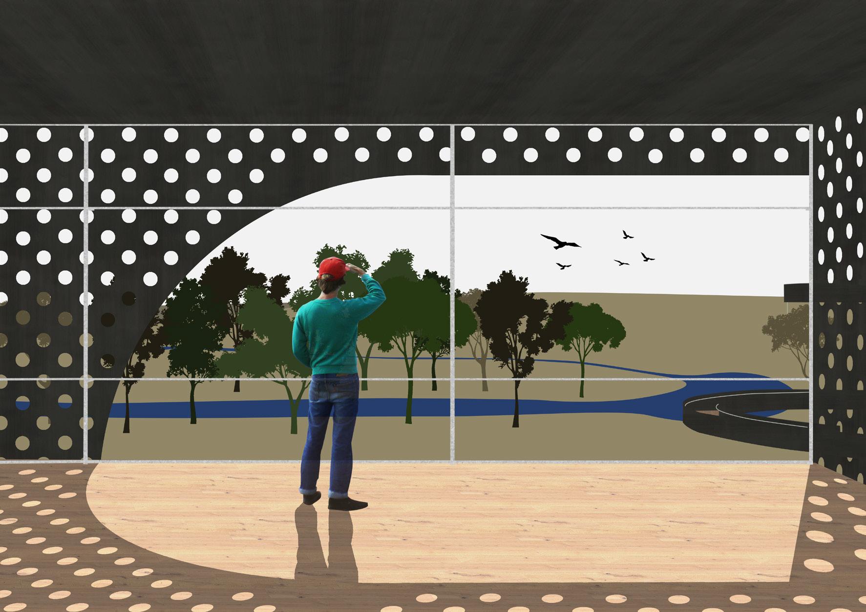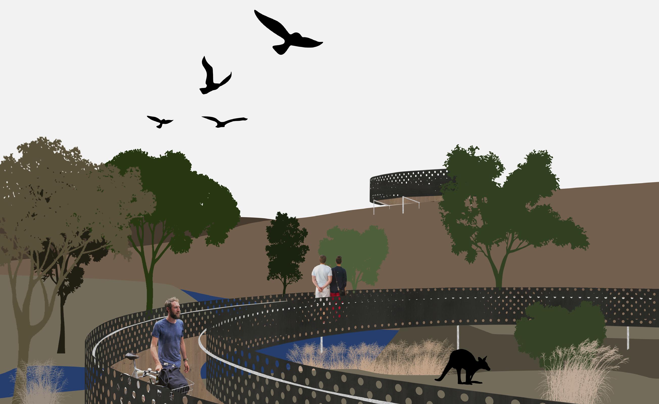 Situated on the edge Sunburys urban sprawl along the remnant woodlands of Jackson Creek are three light interventions that offer access into the undulating terrain. Within this site the project proposes a lookout, bike shelter and bridge that in union are composed to emphasize the sightlines of place. By walking site the experience is an opportunity to interpret the country and waterways where moments of introspection can reveal a context to place. The framing of perforated steel is derived from the construction of housing estates where opaque material skins separate interior from exterior. The application of perforated steel blurs this material boundary between landscape and intervention. Additionally the interventions follow the physical boundaries of site highlighting these conditions and embracing them through movement.
