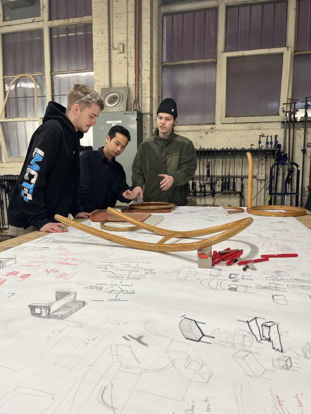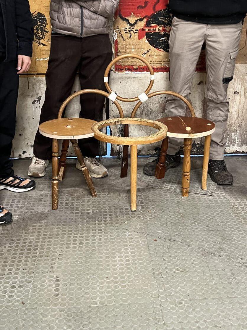 The Three Piece chair was a collaborative project that reassembled four scrap chairs within a four hour time frame. In an ad hoc fashion I discussed with peers to workshop an idea that acknowledges our material constraints. This translated into a curved form deriving from the bent timber chair which could create a strong visual identity.