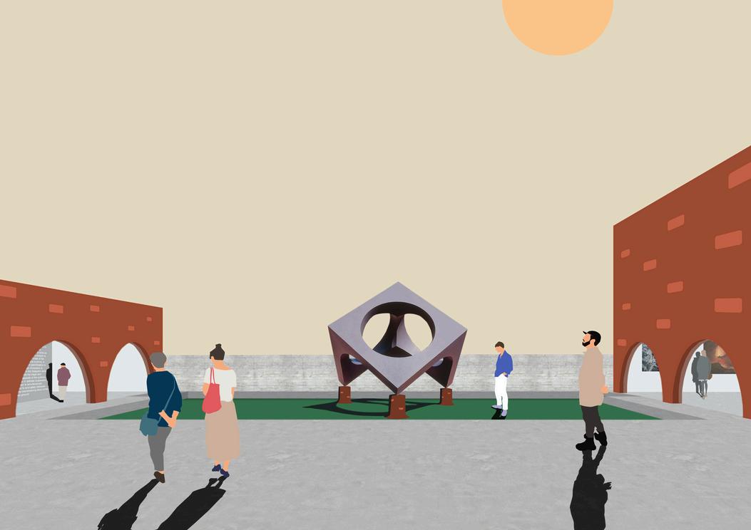 Beginningfromdesigningthegallery’svisuallogothedesign playsonmomentsofsightthatdevelopasenseof anticipationforwhatisbeyondtheknown Thegalleryis dividedbytwoexhibitionpavilionswherearchwaysbuilda tensionbetweentheviewerandobjectthattravelsbetweena blurredspace.Bypairingtherawmassofbrickswiththe transparencyofglassanegativespacecastsan overwhelmingformdirectingaudiencestowardstheinterior gallery