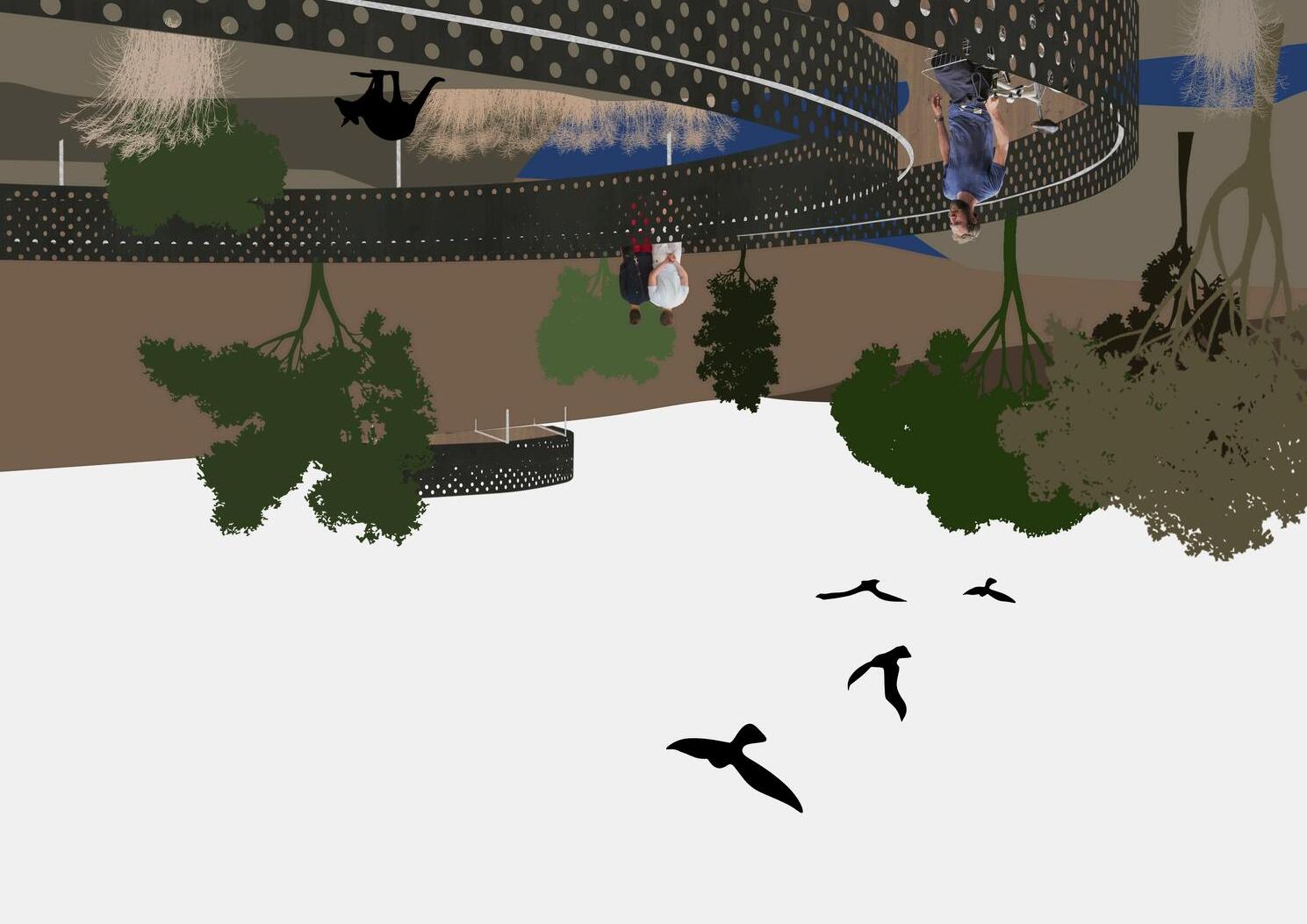 Theframingofperforatedsteelisderivedfrom theconstructionofhousingestateswhere opaquematerialskinsseparateinteriorfrom exterior.Theapplicationofperforatedsteel blursthismaterialboundarybetweenlandscape andintervention Additionallytheinterventions followthephysicalboundariesofsite highlightingtheseconditionsandembracing themthroughmovement.