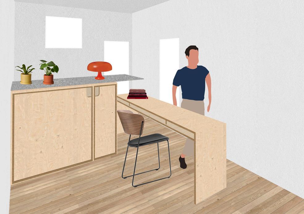 ThisprojectissituatedwithinBestOverends 1936ModernistmultiresidentialCairoFlats andittransformstheapartmentfora contemporarylifestyle Thespaceisdivided byamultifunctionalcountertopcabinetwith concealedfoldoutbedandmodulartable. Thespatialarrangementopensupthe apartmenttothenorthernwindowextending thesenseofplacebeyondtheinterior