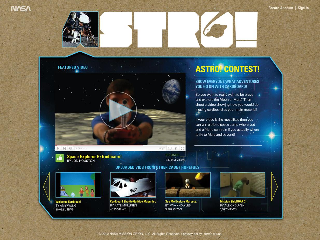 “ASTRO!” IS AN ORGANIZATION WHICH WAS INTRODUCED BY NASA TO PROMOTE INTEREST IN SPACE EXPLORATION TO THE YOUNGER GENERATION OF AMERICANS. A WEB-BASED VIDEO CONTEST, AS WELL AS, COLLATERAL PIECES WERE CAREFULLY DESIGNED TO SET THE PERFECT WHIMSICAL TONE FOR THE CAMPAIGN.