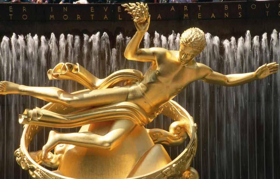 Prometeo, héroe griego roba el fuego para que los seres humanos puedan hacer uso de este valioso elemento, también símbolo del conocimiento, por lo que Zeus lo castiga y encadena en una roca. (Rockefeller Center de Nueva York)
