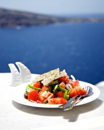 En su forma original la ensalada Horiatiki se prepara con lechuga, y es un platillo simple y refrescante conocido en Grecia como “ensalada del pueblo”. En la actualidad esta ensalada se prepara con jitomates pequeños de todos colores (rojo, amarillo, café oscuro), cebollas rojas, pimiento verde, pepinos, aceitunas Kalamata, orégano, aceite de oliva, sal y rodajas de queso feta.