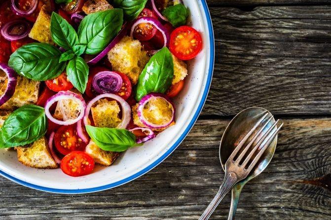 La ensalada de pan, o Panzanella, comienza el estilo de la Toscana con vinagre de jerez añejo y aceite de oliva, que podría ser la clave de su perfección. La receta consiste en mojar trozos de pan de campo de días anteriores en una mezcla salada de vinagre de jerez, absorber toda la salmuera, y mezclarlos con cebolletas picadas, jitomate maduro, pepinos y apio, y agregar aceite de oliva y albahaca. Los orígenes de esta ensalada se remontan a siglos atrás, como una comida barata elaborada por los campesinos toscanos con las sobras y los