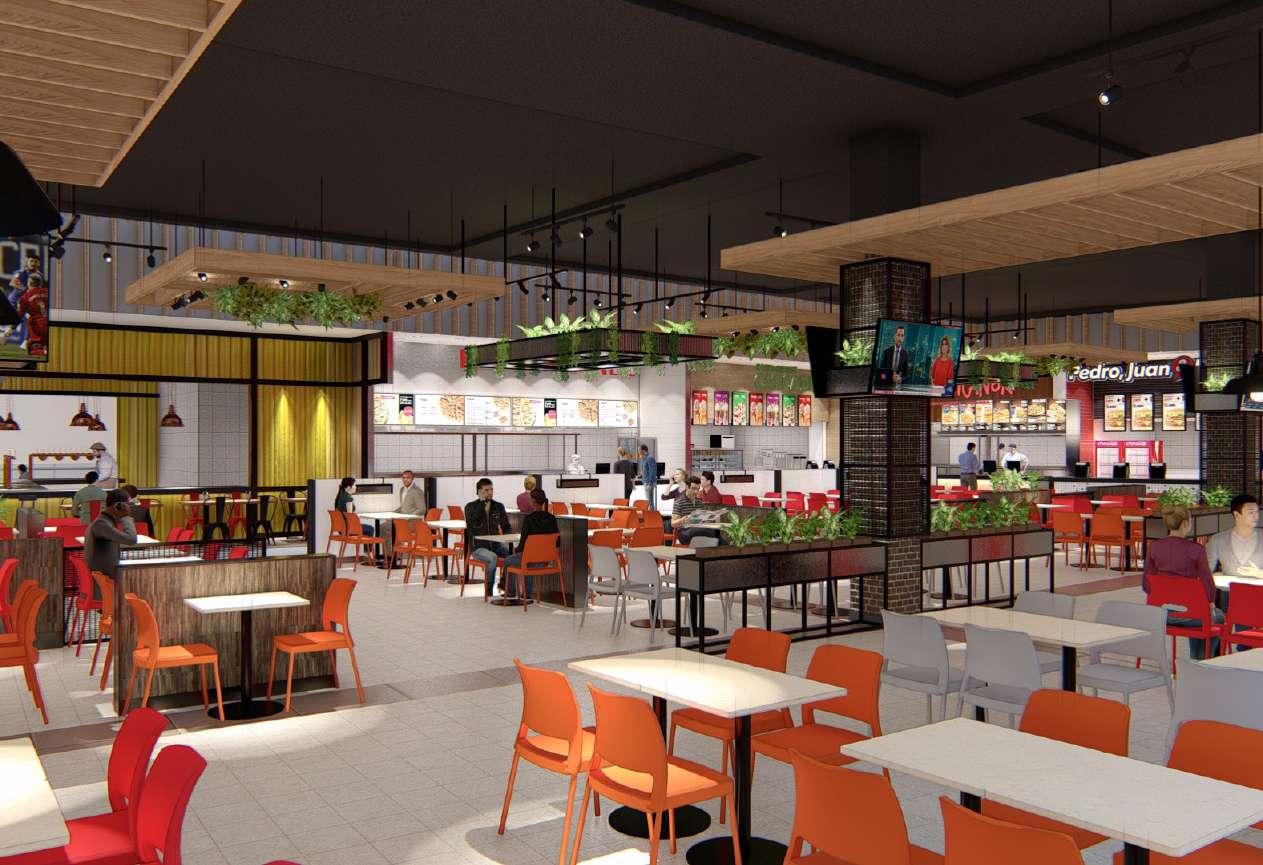 Diseño de todo el interior del patio de comidas del Mall Plaza Maule, incluyendo todo el mobiliario, pisos, reutlización de mesas y sillas, cambio de luces, separadores, diseño de mobiliario para plantas, cielos, cenefas existentes.