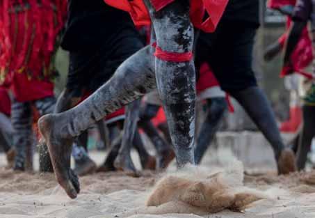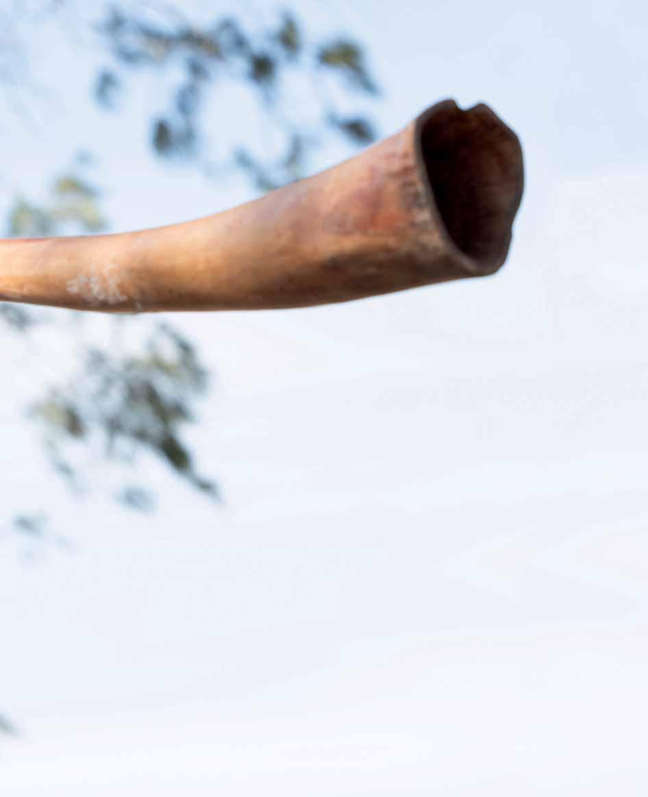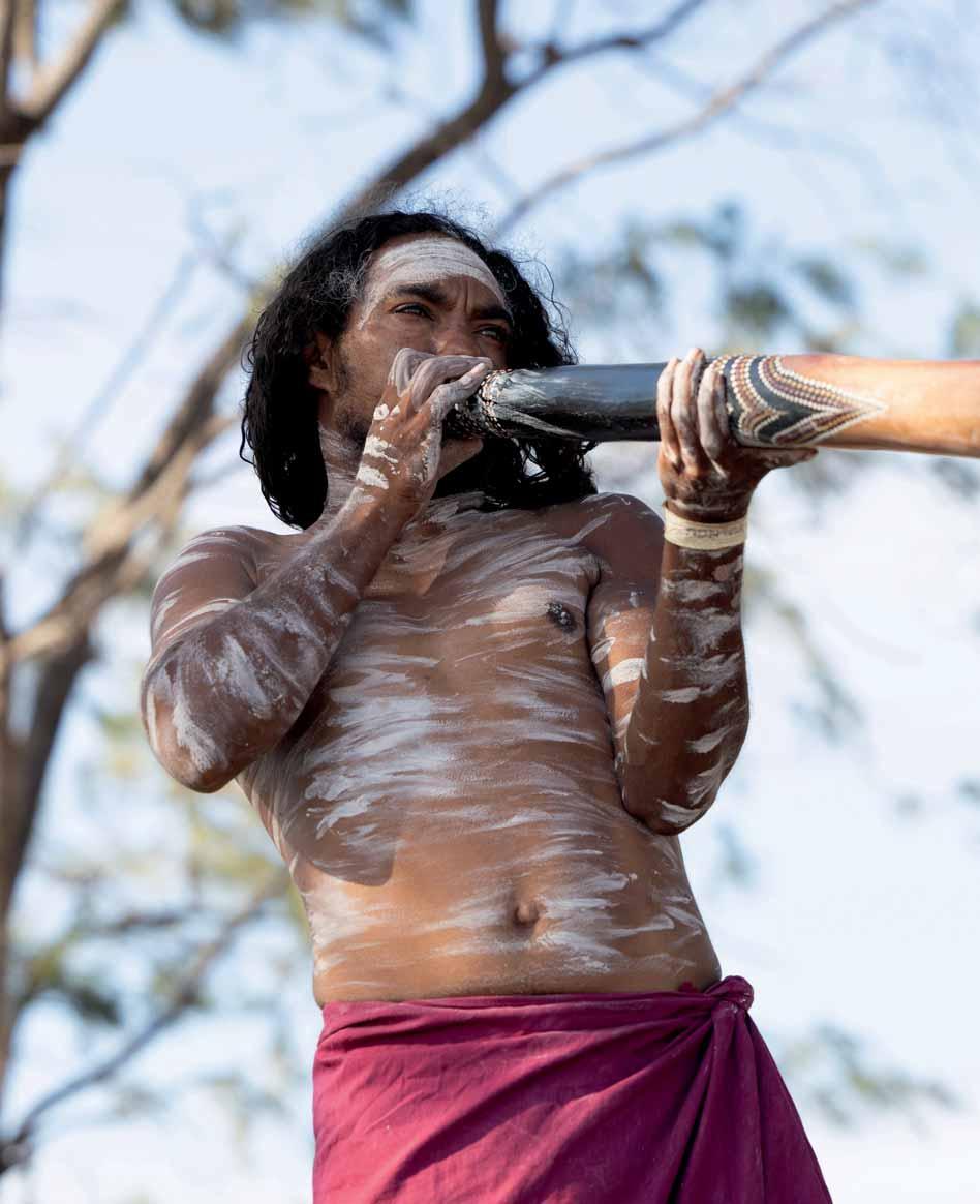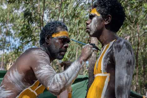 ne lumière dorée caresse l’escarpement du site sacré de Gulkula. Les corps peints de jaune, couleur du feu Gurtha, des danseurs Yolngu valsent. Leurs pieds soulèvent le sable mêlé de terre rouge autour des larrakitj, troncs creux dressés, pôles sacrés de la loi d’Arnhem, le Rom. Les bâtons de rythme claquent, les didgeridoo vibrent et racontent des histoires immémoriales.